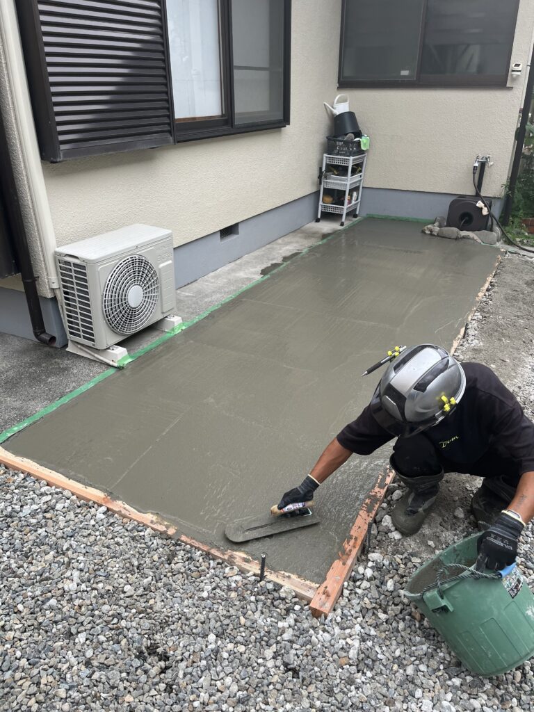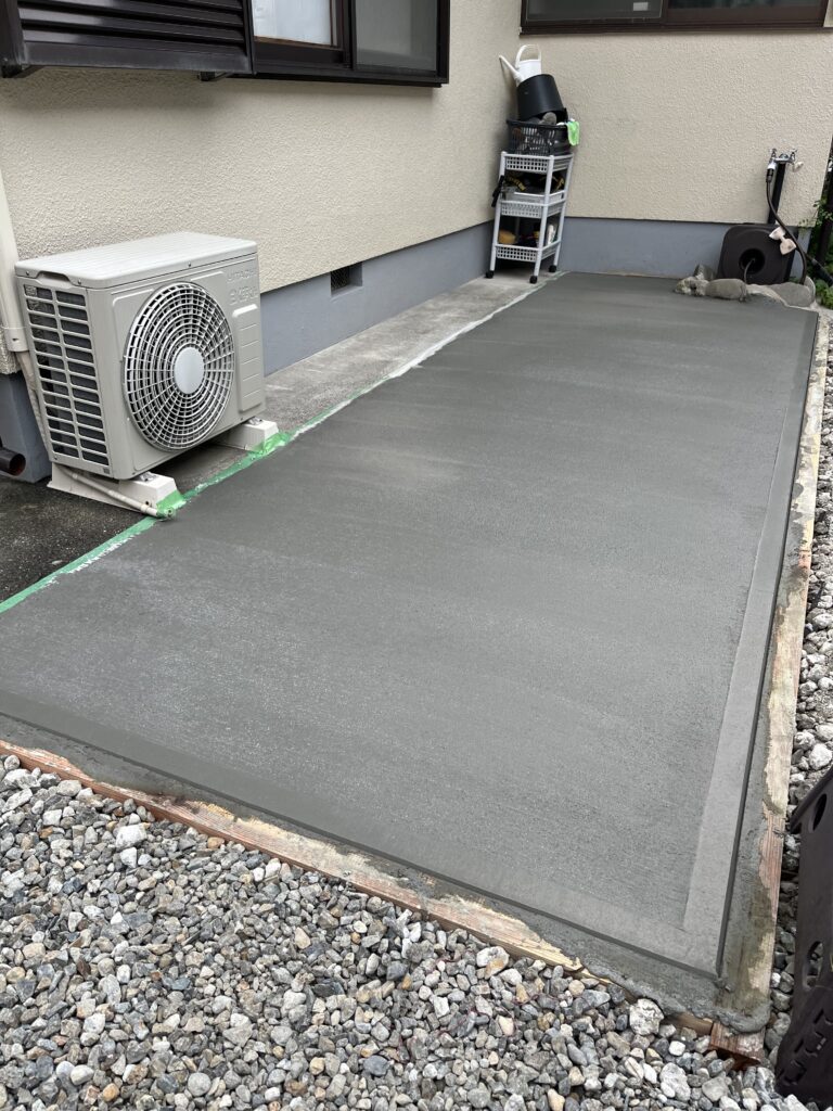 富士市で土間コンクリートの施工です。施主様より既設の土間がポロポロしてしまうとご相談があり、加えてバイク置き場として一台分のみ土間のご依頼です。